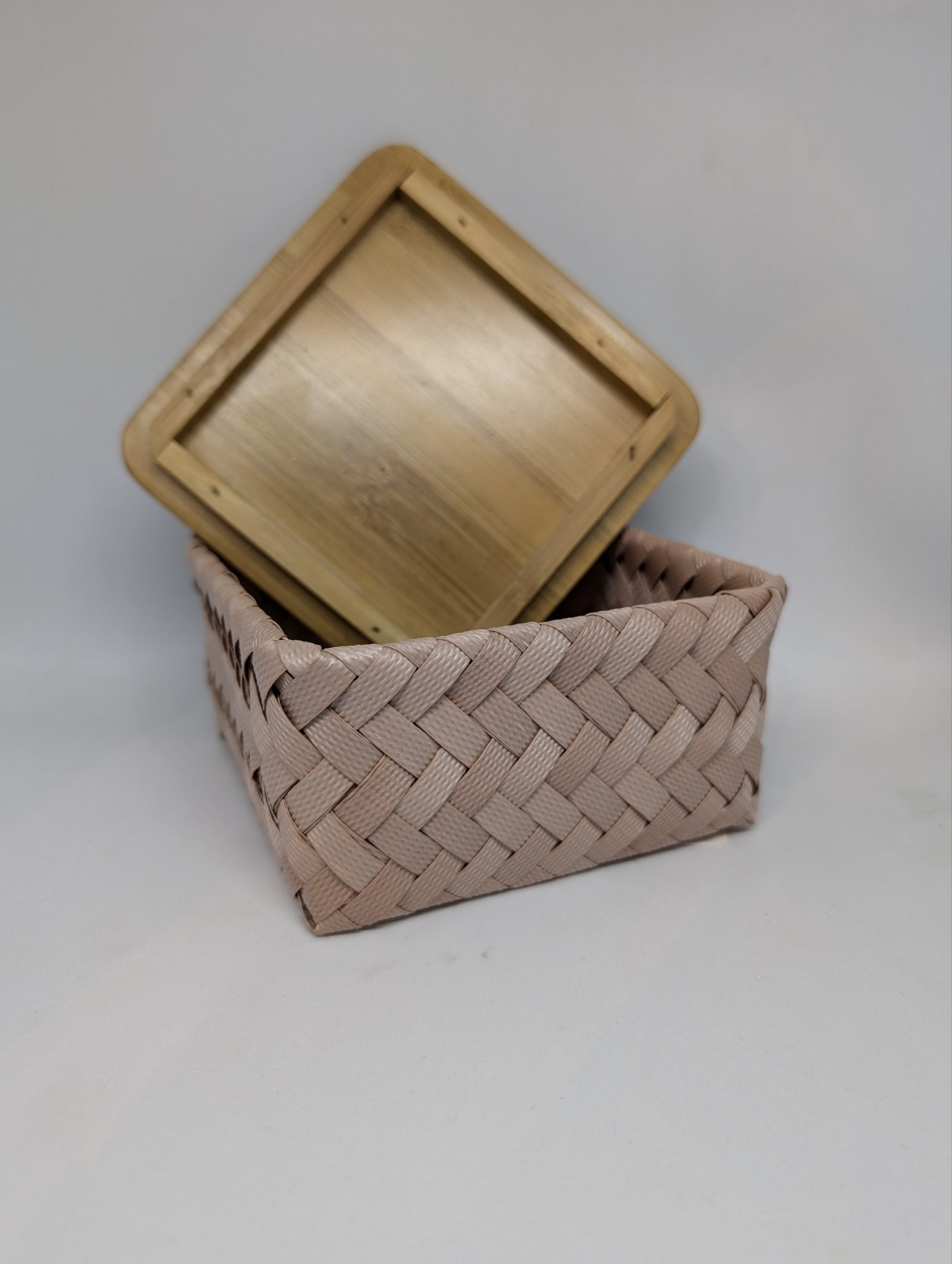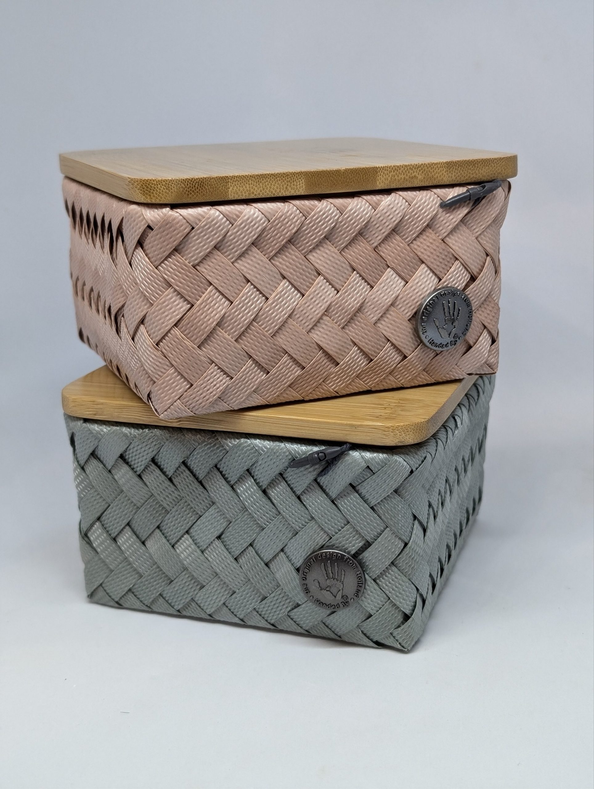 Petite boîte en plastique recyclée et couvercle en bambou Disponible en 2 coloris gris ou rose Sa...