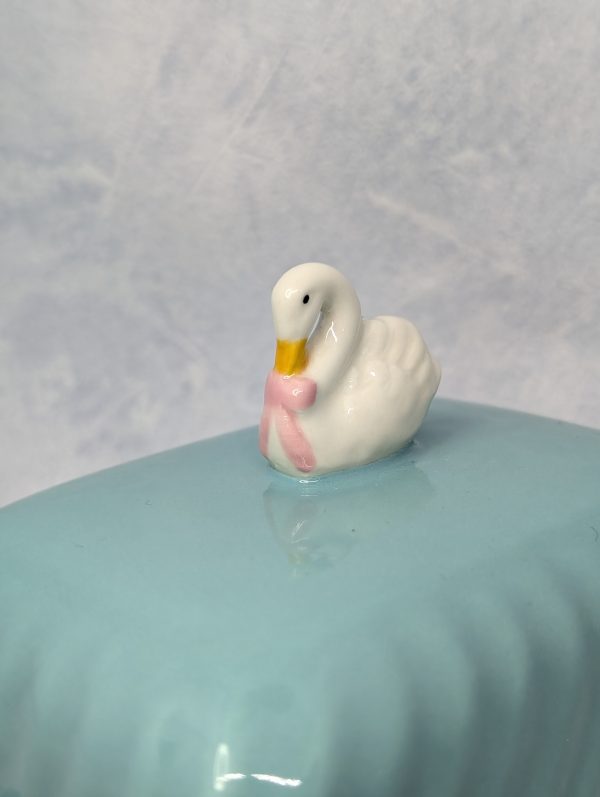 De couleur bleu avec des petites vagues en relief, il se distingue par son couvercle surmonté d’un adorable cygne blanc.