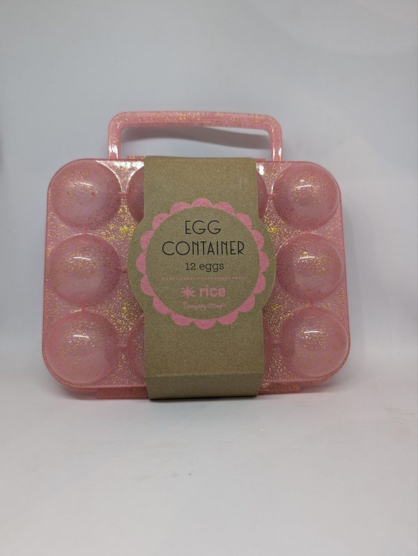 Boite à œufs rose à paillettes de la marque Rice en mélamine avec une poignée.