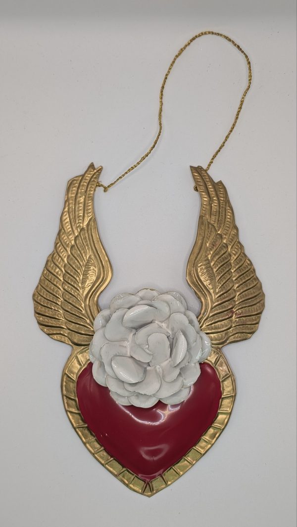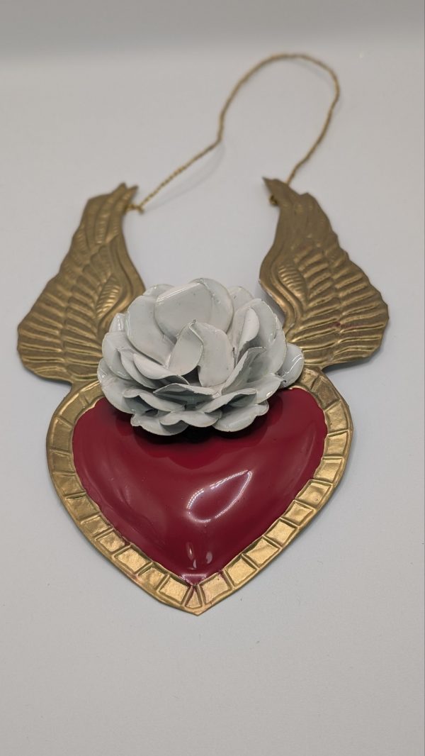 Jolie cœur ex-voto avec un cœur rouge et une belle fleur blanche