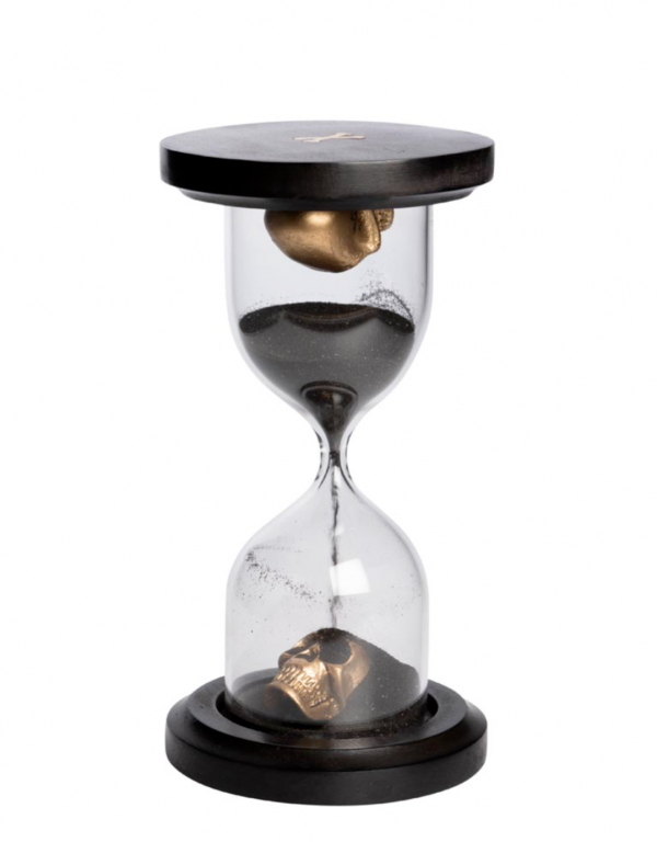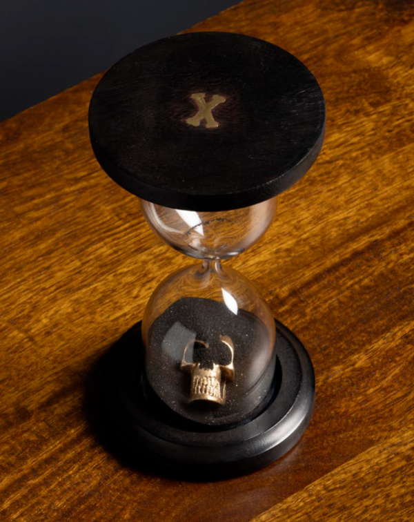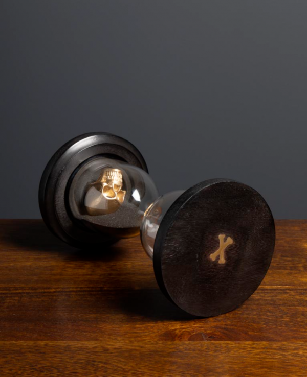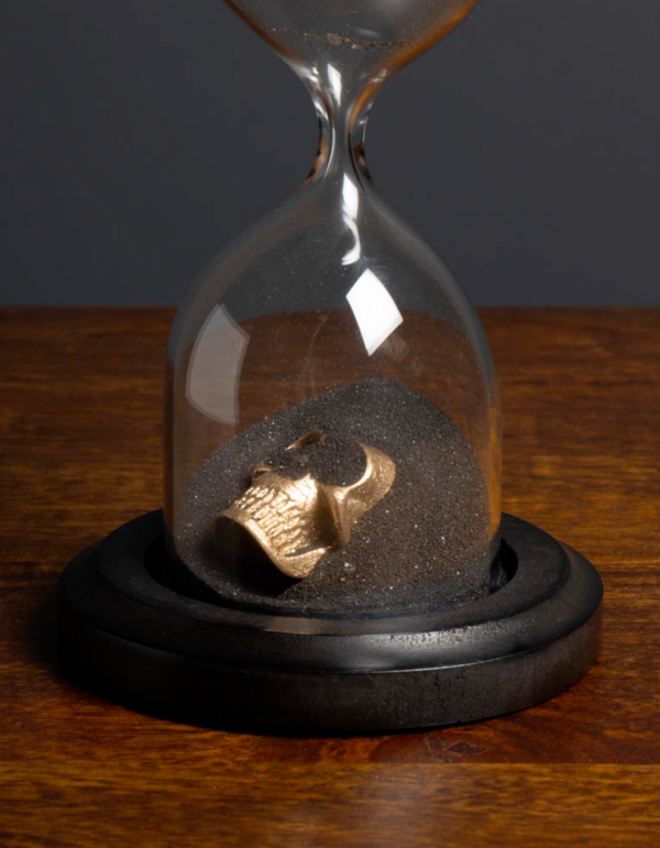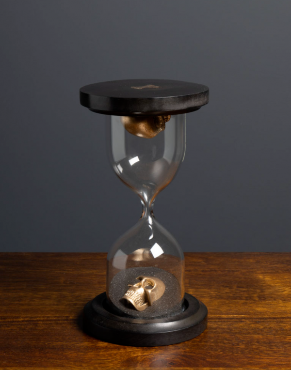 Jolie sablier noir en verre avec des têtes de mort des deux côtés